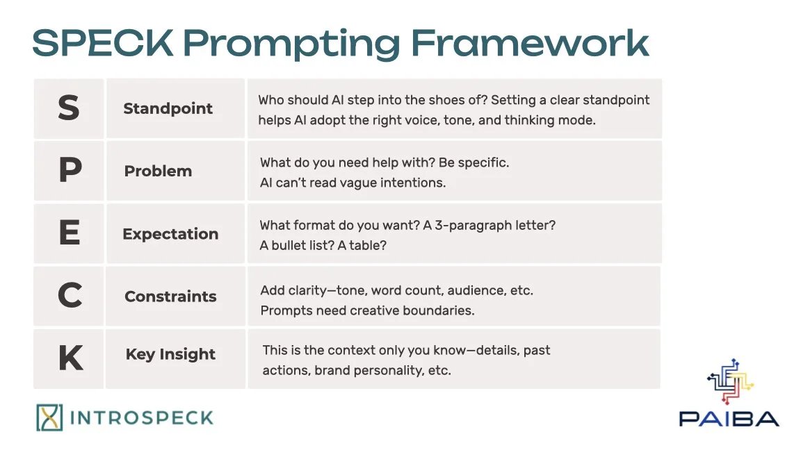 SPECK™ Prompting Framework – 5-part AI prompt structure including Standpoint, Problem, Expectation, Constraints, and Key Insight